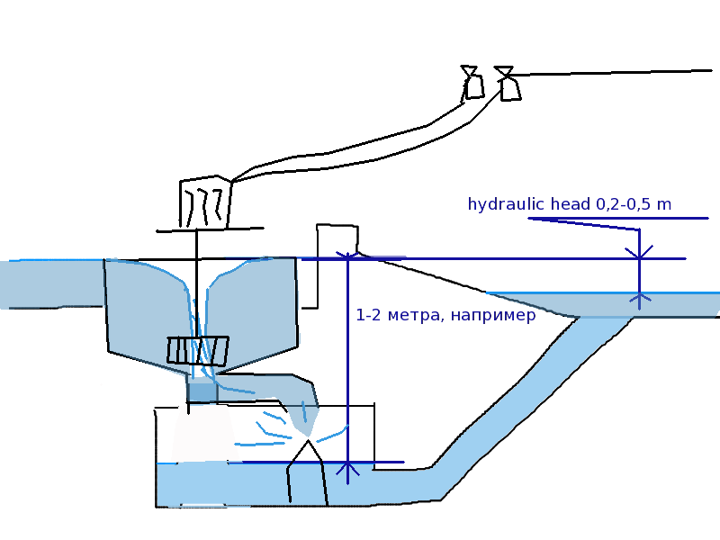 > потом водой вращать колесо? Как быть с пик? Минимальный напор - 2 метра, то есть нужна плотина не меньше 2,5 метров высотой.
