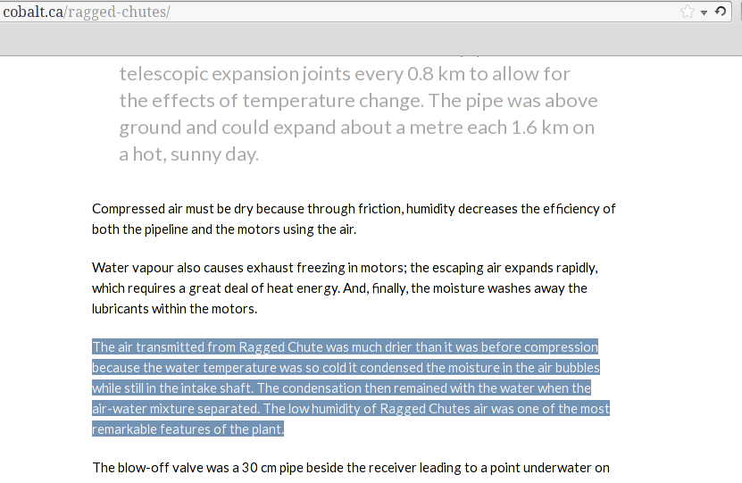 >>147552 > анон утверждает >вода сушит воздух >анон утверждает The air transmitted from Ragged Chute was much drier than it was before compression because the water temperature was so cold it condensed the moisture in the air bubbles while still in the intake shaft. The condensation then remained with the water when the air-water mixture separated. The low humidity of Ragged Chutes air was one of the most remarkable features of the plant. http://cobalt.ca/ragged-chutes/