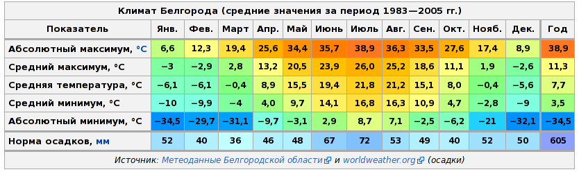 Далее открываю вики и ищу статью про Белгород - интересует количество осадков. В течении года они выпадают более менее равномерно и общее количество их 605 мм(0,6 м) Пик 3