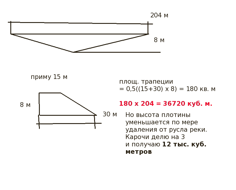 Пик2 - диванные расчеты объема грунта в теле плотины. Получилось около 12 тыс. куб. метров. И это я занизил например высоту -принял ее как 8 метров(хотя плотины всегда выше уровня пруда на пару метров). И я не стал учитывать ту часть трапеции, что под водой пруда.