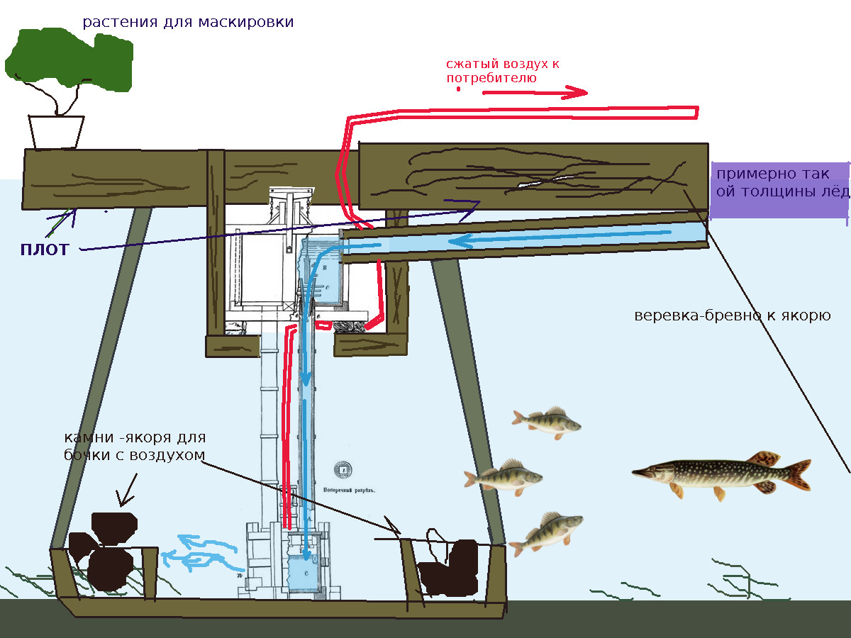 Нижнюю бочку-воздухоприемник жестко скрепить с деревянными клетками, наполненными камнями. Эти клети можно так же жестоко скрепить с плотом. Кроме того выше по течению надо затопить несколько клетей с камнями - якорей. И плот привязать к этим якорям.