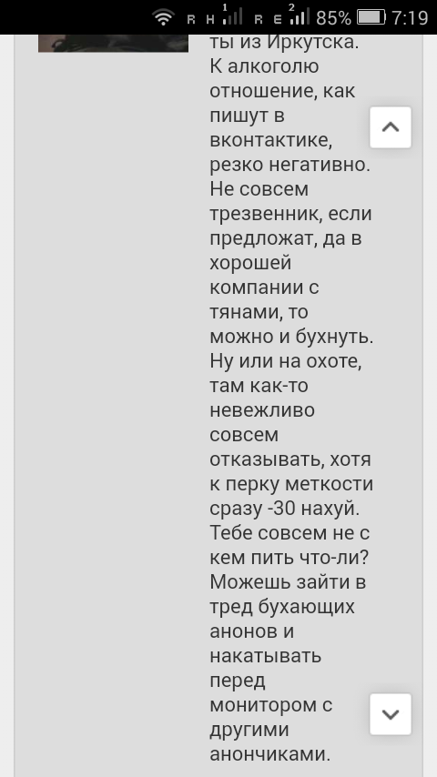 >>157801 Лалка. Читал твою уютненькую пока на вахте был. Завидую тебе по хорошему. У тебя вроде семья адекват, жить есть где, лес для бродить есть, брат вроде с руками и шабашки подкидывает. Только ты хернеи маешься. Хотя это нормально конечно тоже. Пили за таигу и жизнь в селе.