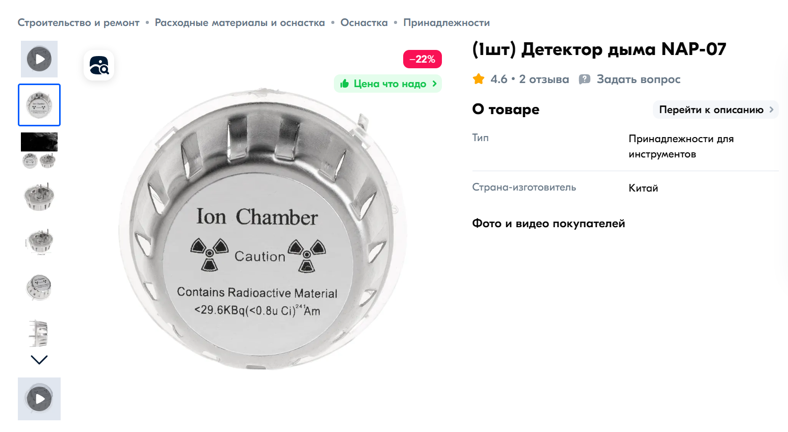 Для тех кто в танке, это ионизационная камера для датчиков дыма. Весь ее прикол в том, что в ней содержится Am 241 (Америций) продукт распада Pu 241 (Плутоний) который используется как ядерное топливо в реакторах. Хотя Америций и альфа активен, трубки СБМ в дозиметрах все равно его чувствуют, даже богомерзкий показометр Radex 1503 и РКСБ 104 начинают показывать трехзначные числа на табло.