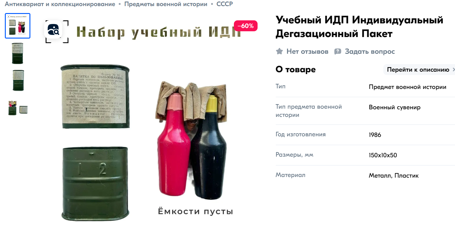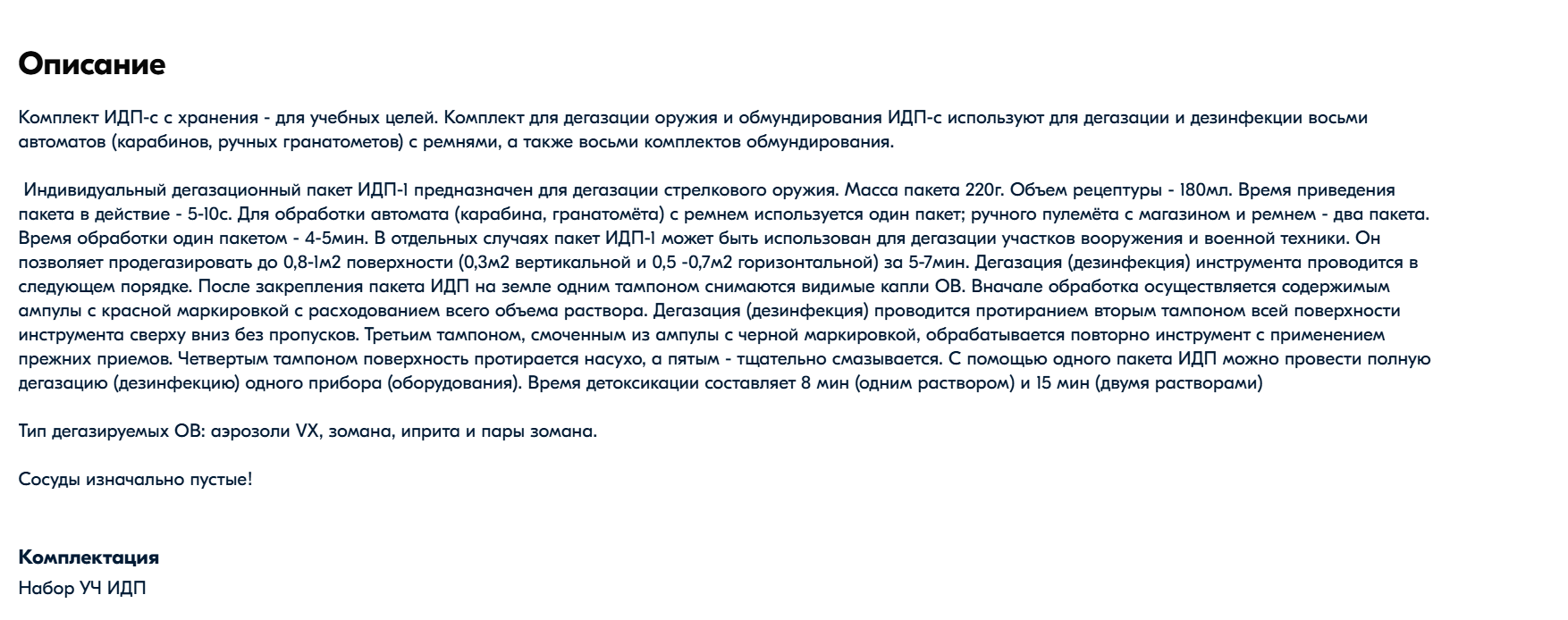 Уч. ИДП Индивидуальный дегазационный пакет ИДП-1 предназначен для дегазации стрелкового оружия. Масса пакета 220г. Объем рецептуры - 180мл. Время приведения пакета в действие - 5-10с. Для обработки автомата (карабина, гранатомёта) с ремнем используется один пакет; ручного пулемёта с магазином и ремнем - два пакета. Время обработки один пакетом - 4-5мин. В отдельных случаях пакет ИДП-1 может быть использован для дегазации участков вооружения и военной техники. Он позволяет продегазировать до 0,8-1м2 поверхности (0,3м2 вертикальной и 0,5 -0,7м2 горизонтальной) за 5-7мин. Дегазация (дезинфекция) инструмента проводится в следующем порядке. После закрепления пакета ИДП на земле одним тампоном снимаются видимые капли ОВ. Вначале обработка осуществляется содержимым ампулы с красной маркировкой с расходованием всего объема раствора. Дегазация (дезинфекция) проводится протиранием вторым тампоном всей поверхности инструмента сверху вниз без пропусков. Третьим тампоном, смоченным из ампулы с черной маркировкой, обрабатывается повторно инструмент с применением прежних приемов. Четвертым тампоном поверхность протирается насухо, а пятым - тщательно смазывается. С помощью одного пакета ИДП можно провести полную дегазацию (дезинфекцию) одного прибора (оборудования). Время детоксикации составляет 8 мин (одним раствором) и 15 мин (двумя растворами)
