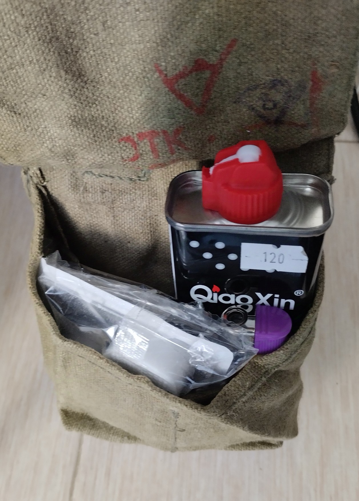 >>183664 Вот этот подсумок, (подгранатник) Я его предложил использовать как сумку для хранения причиндалов для разведения огня. Ну он оказался немного меньше чем я думал. В него влезло две упаковки сухого горючего (квадраты с таганком), коробок спичек, зажигалка и бензин в банке. О подсумке. На застежки окислы меди, затхлый запашок, год выпуска не ясен. Он целый, без потертостей и следов использования. Новый. Да это тру штукенция армии СССР.