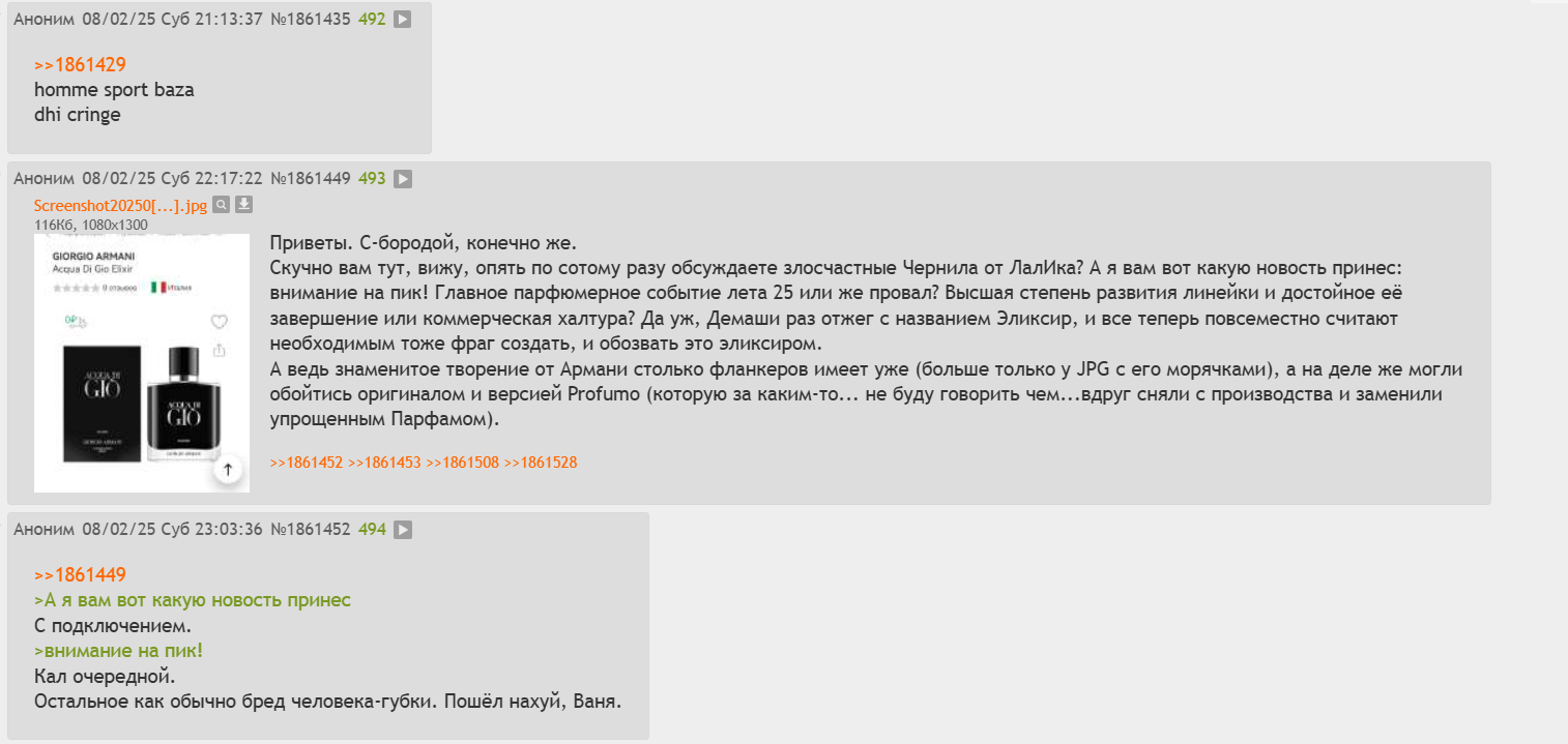 >>1861494 >>1861497 Так Иван реально больной, с представлением об отношениях с женщинами на уровне великовозрастного карикатурного девственника, делающего вид, что он секс-машина. Архетипичный персонаж такой. С парфюмерными советами от него та же тема - либо пересказ содержимого треда, причём чаще всего ошибочный, либо рассказы про саваж эликсир и всратый 1996, который я ему посоветовал в своё время, и такое чувство, что за столько времени этот болван больше ничего не придумал.