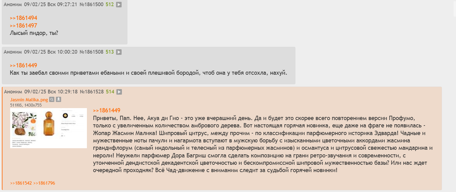 >>1861449 Приветы, Пап. Нее, Акуа ди Гио - это уже вчерашний день. Да и будет это скорее всего повторением версии Профумо, только с увеличенным количеством амбрового дерева. Вот настоящая горячая новинка, еще даже на фраге не появилась - Жопар Жасмин Малика! Шипровый цитрус, между прочим - по классификации парфюмерного историка Эдварда! Чадные и мужественные ноты пачули и нагармота вступают в мужскую борьбу с изысканными цветочными аккордами жасмина грандифлорум (самый индольный и телесный из парфюмерных жасминов) и османтуса и цитрусовой свежестью мандарина и нероли! Неужели парфюмер Дора Багриш смогла сделать композицию на грани ретро-звучания и современности, с утонченной дендистской декадентской цветочностью и бескомпромиссной шипровой мужественностью базы? Или нас ждет очередной проходняк? Всё Чад-движение с вниманим следит за судьбой горячей новинки!