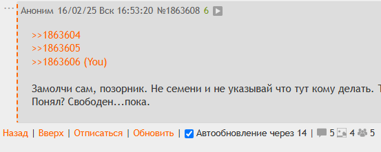 >>1864542 Репорт. сейчас еще с четырех IP продублирую - не я эту войну начинал Ну не будешь, не будешь ты тут сквернословить и на пустом месте оскорбления сыпать. Пусть я не прошел в модераторы этой осенью, но будет следующая - вновь баллотироваться буду. И верну треду ламповость 19 года, когда никакого Коляскомана-хейтера и токсика не было.