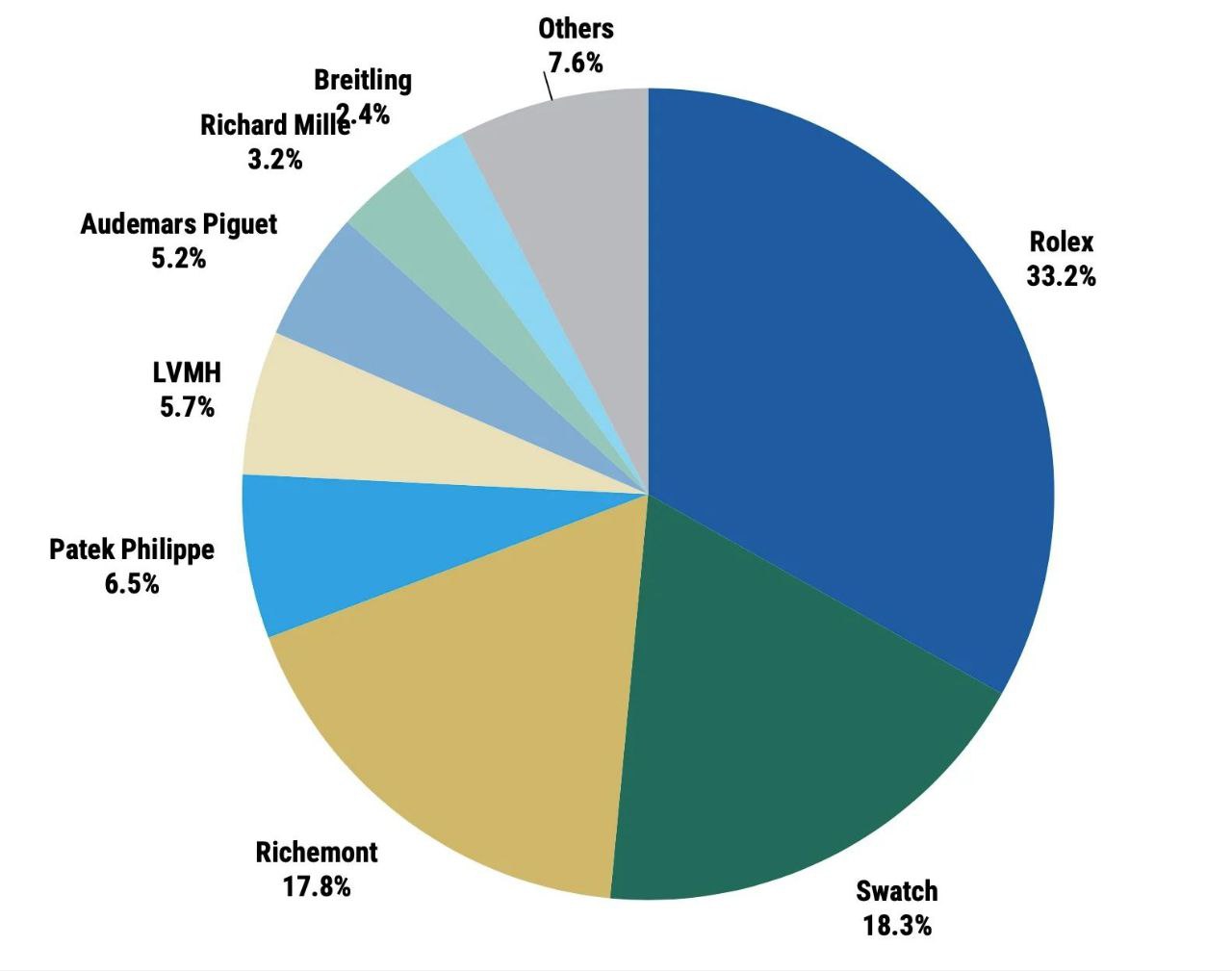 Топ 20 марок - по продажам и по обороту по предположениям аналитиков Morgan Stanley. Пятерка лидеров осталась прежней: безусловный лидер Rolex (с оборотом, выросшим на 500 млн франков), Cartier на втором месте, Omega - на третьем, Audemars Piguet на четвертом и Patek на пятом. Также в диаграммах - доли рынка брендов и групп.