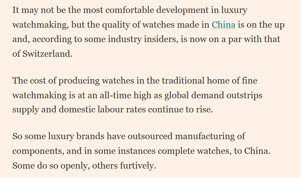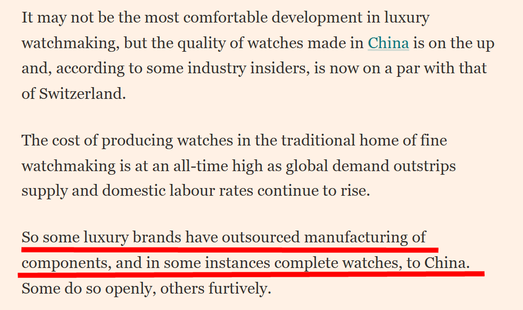 В ответ мне была показана статья финаншиал таймс, из которой следует только то, что необходимо устанавливать для каждой марки, использует ли производственные мощности других государств или нет. Стоит подчеркнуть, что основными спикерами статьи являются люди, которые строят свою стратегию на том, что делают часы в Китае и не скрывают этого, однако и они подчеркивают, что механизма уровня Патек Филипп Китай делать не может. Говоря коротко, со своей позицией выступают заинтересованные люди.
