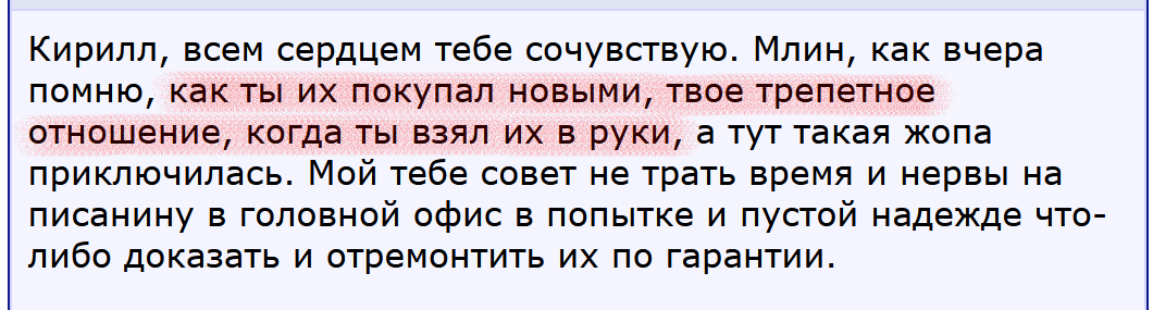 Кстати, там есть любопытная фраза, цитирую, "просто... не хотелось, сразу после покупки.. сами понимаете" - кто-то понимает, почему статусный господинчик не хотел пердолить браслет сразу после покупки? Может разъебанные пальцы сильно болели, ждал пока заживут?