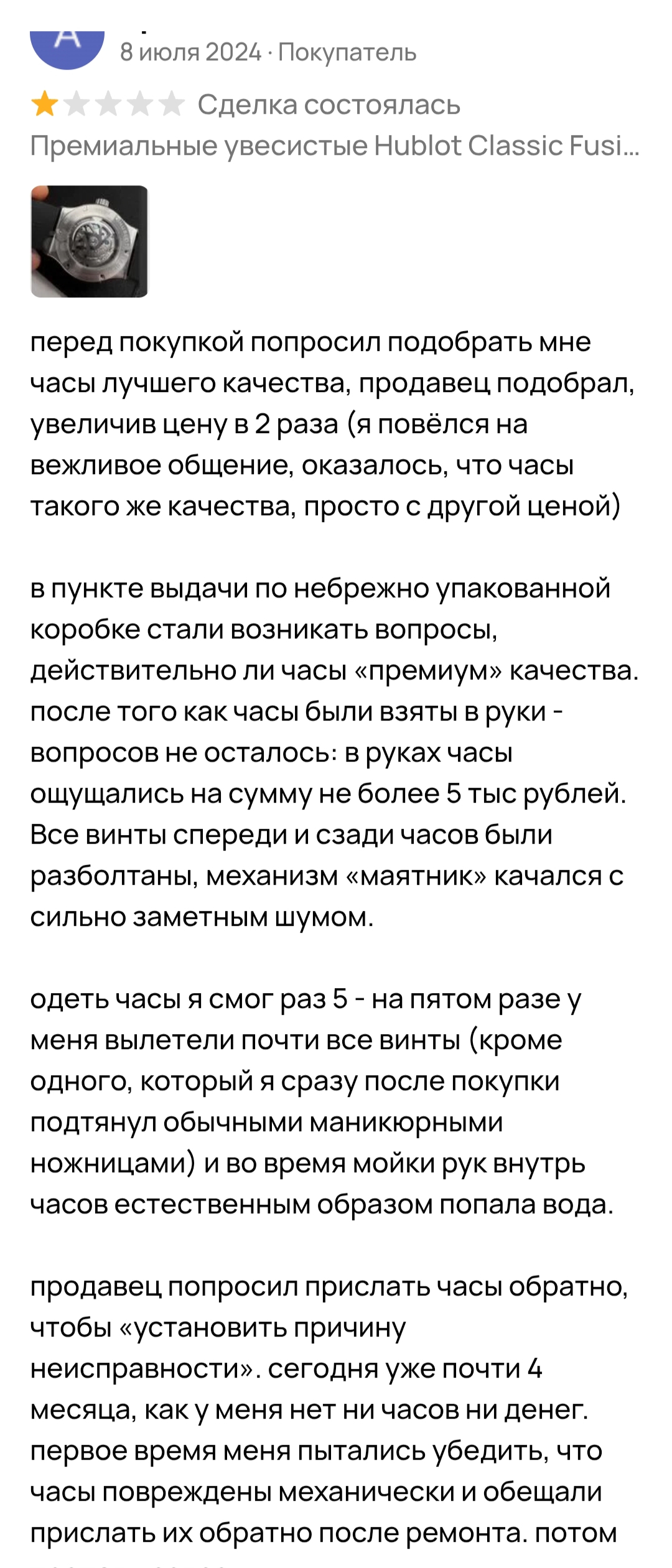 >>1867314 Давай сейчас точки над и расставим, а потом ты мне сам скажешь ответ. Мне 34 года, в наличии семья, 3 квартиры, бизнес с оборотом на 160 миллионов, две иномарки вольво и мерс, 5 раз в год я летаю с супругой или детьми туда, куда пальцем тыкну. И ты мне сейчас серьезно предлагаешь купить какой-то суроггат черт пойми откуда, вместо нормальных часов?
