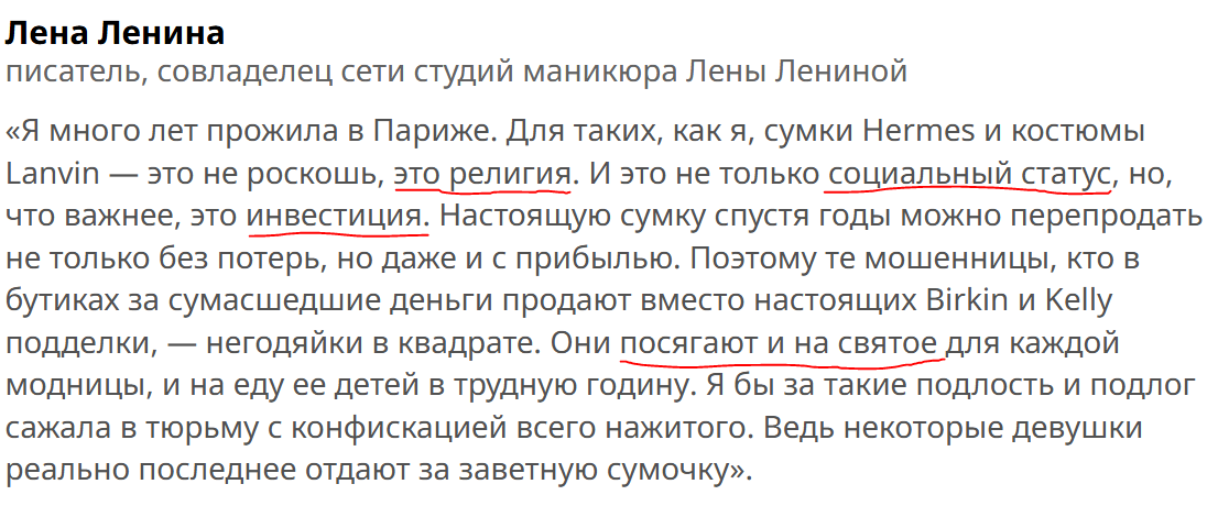 >По информации Mash, теперь Николина должна выплатить Hermes 599 тысяч рублей. Кроме того, ей необходимо заплатить государству штраф в размере 200 тысяч рублей. Также уточняется, что руководству бренда пришлось вызвать экспертов на склад с целью найти подделки и утилизировать их. Если черипикаешь, то хотя бы полностью историю скидывай Алсо если не уверен в оригинальности своего приобретения либо через сайт смотришь по индивидуальному коду, либо идешь в спец центр где тебе специалисты пояснят за шмот за страну производства