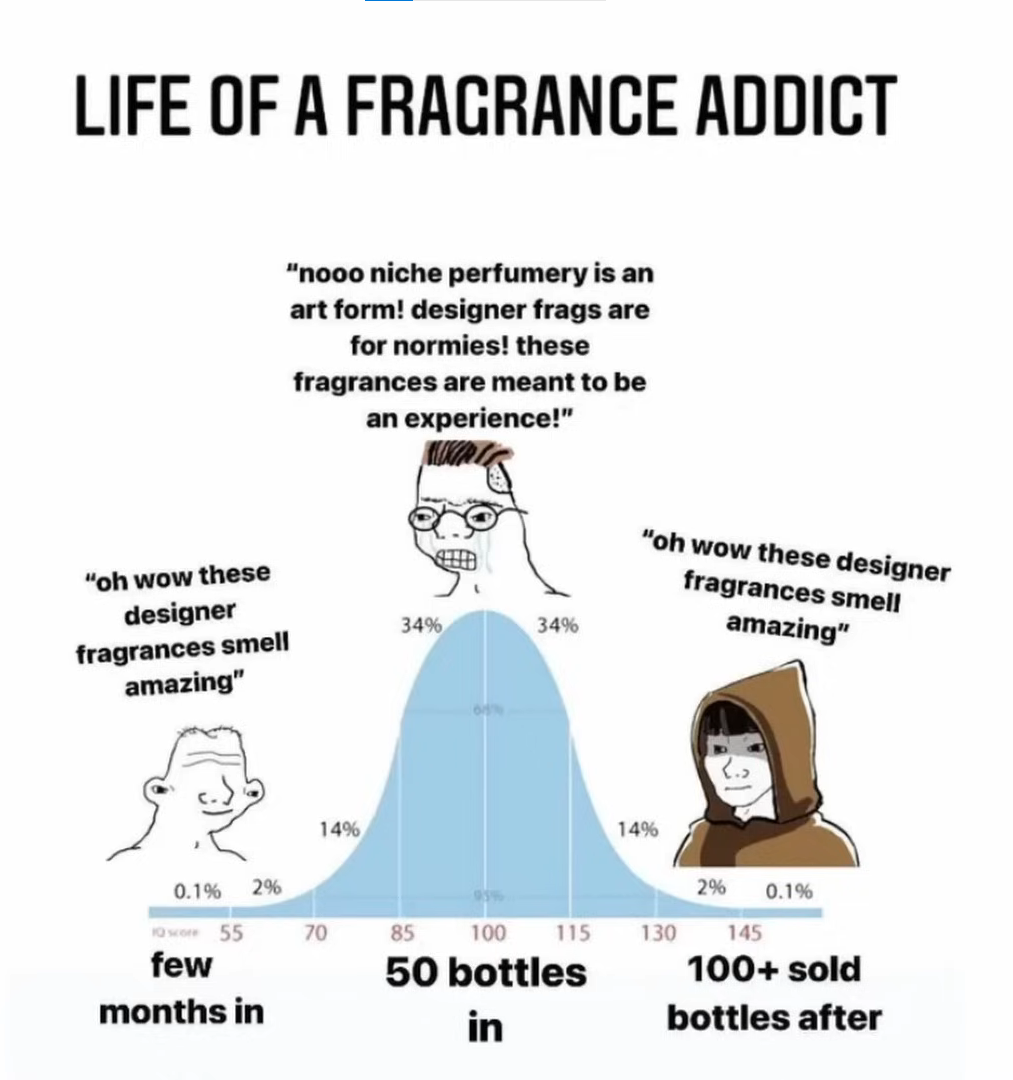 >>1895294 > чем больше чел увлекается парфюмерией - тем выше шанс на то, что он будет пахнуть каким то говном. Потому что хочется всегда чего то необычного, но окружающим это всегда не заходит Ну, да, всегда так было. Тут как бы или ты любишь парфюмерию как таковую и тебе тогда в целом насрать на мнение окружающих, либо пользуешься вонючей водой в сугубо практических целях и тогда проебаться достаточно сложно. Оба подхода по-своему хороши и порицать их не за что. Но вот преследовать обе цели одновременно — прямой путь к шизе.