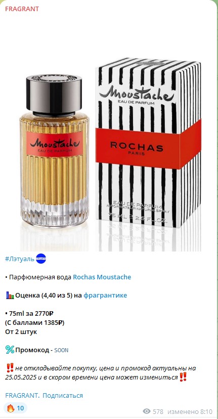>>1896258 Да их много, ну например t. me/fragrantmi чисто по скидкам на парфюм (на пике сегодняшняя скидка). У этого канала есть чат, туда надо проситься стучаться к админу, пускают не всех, а только тех кто в теме. И ранее я писал, что есть каналы всяких блогеров, у каналов есть чаты, в которых трут за парфюмерию, скидки и в этом роде. Такие чаты у всех есть, у Пашко, у лысого, у шляпника, у Квасина и т.д.