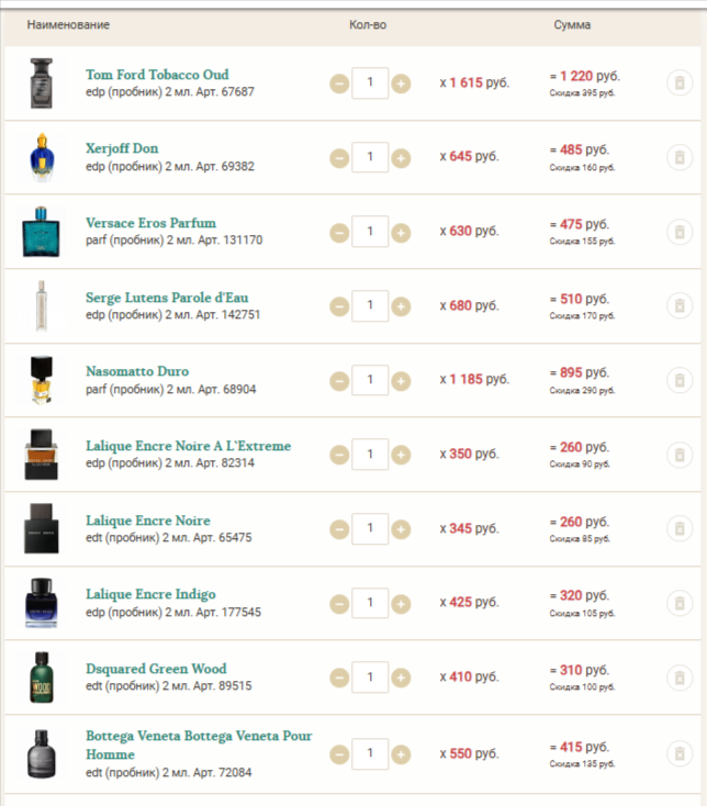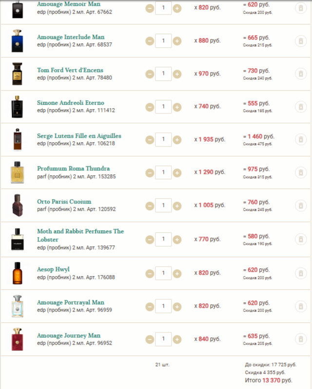 Я пока накидал себе такой список, половину буду брать с аллюра, половину с рандеву: Amouage Memoir man Р Amouage Interlude man Р Amouage Journey man А Amouage Portrayal man А Aesop Hwyl. А Bottega veneta pour homme Р Hensley Perfumes Fume - JMP Artisan perfumes Fir of the Dark - Lalique Encre indigo. Р Lalique Encre noire. Р Lalique Encre noire a l'extreme. Р Moth and Rabbit the Lobster. А Orto Parisi Cuoium Р А Pineward perfumes and colognes - Profurum roma Thundra А Profurum roma Arso. нет отливантов Serge Lutens Parole d'eau Р Serge Lutens Fille en Aiguilles А Simone Andreoli Eterno А Slumberhouse norne. rip Stora Skuggan Pine. - Tom Ford Vert d encens А Versace Eros. Р Wald Euphorium Brooklyn -