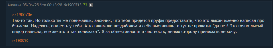 >>1902878 Весьма интересное наблюдение: когда речь идёт об обвинениях в пиздабольстве в контексте его знакомства с кем-то из /fa/, наш лысый олигофрен начинает проявлять совершенно нетипичные для себя черты в виде резкой агрессии и требования предоставить пруфы. Так было неоднократно. Поскольку доказать лживость всех рассказов Вани о том, что он знаком с кем-либо, кого он записывает в свои друзья, весьма просто, ведь достаточно только спросить, он моментально начинает включать старую шарманку про "подражателей", а в посте на втором пике в свойственной ему манере угрожает написать в Спортлото /d/, если его кляузу немедленно не рассмотрят, тем самым лишний раз подкрепляя свой статус стукача и крысы, которым он прославился. Кроме того, он пытается от лица "обеспокоенной общественности" активно продвигать антикриз о "подражателях", а также требует предоставить пруфы, что это постил Иван, а не кто-то другой. Однако подобные тейки про "лжеиванов" никем, кроме самого Вани, не применяются, что выдаёт с поличным авторов этих постов. Стиль письма Вани, характерный использованием имён собственных, которых он раздаёт своим "друзьям" и "врагам", использованием термина "Фа" с заглавной буквы, в контексте наименования борды, также прослеживается вот в этом >>1902884 посте. Столь активная реакция на подтверждение обвинений в пиздабольстве позволяет сделать вывод, что Вано действительно пиздел о знакомстве с бородатым модником из закрепа, пытаясь таким образом набить цену себе и своим фантазиям о некоем клубе любителей олл-блэка, в который он уже успел записать всех, кого знает, и кому успел раздать прозвища. Напомню, что на посты Ивана этот т.н. "Бэтмен" не отвечал, и подтвердил, что ИРЛ с ним не знаком. Подобный срыв покровов наносит серьёзный урон по той картине мира, которую выстроил для себя Ваня, и которую он пытается воплотить хотя бы виртуально. Попытка убедить анонов в том, что у него здесь есть друзья, с которыми он организует некие "клубы" и ходит пить виски, с треском провалилась.