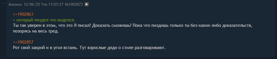>>1902878 > В реале, конечно, по голове бы тебя постучать просто надо - да так, чтобы на всю жизнь прекратил без каких-либо доказательство что-то там публично заявлять. Ванют, ты ж допиздишься рано или поздно, тут достаточно людей из ДС-2, которых ты насмерть заебал.