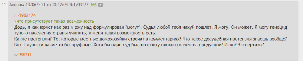>>1903174 >что присутствует такая возможность Додь, я как юрист как раз и ржу над формулирован "могут". Судья любой тебя нахуй пошлет. Я могу. Он может. Я могу геноцид тупого населения страны учинить, у меня такая возможность есть. Какие претензии? Те, которые местные домохозяйки строчат в комментариях? Что такое досудебная претензия знаешь вообще? Вот. Глупости какие-то беспруфные. Хотя бы один суд был по факту плохого качества продукции? Иски? Экспертизы?