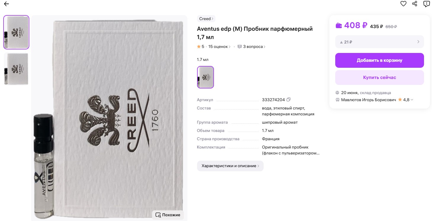Мне с wb пришел оригинальный пробник Авентуса от Мавлютова, которого здесь кидали. По цене за мл вышло дешевле, чем у самых дешевых распивщиков (230 за 1 мл). Это несомненно оригинал, ну не будут китайцы так заморачиваться над красивой бумагой, тиснением серебряными буквами, там даже батч есть, который правда не пробивается, видимо у пробников свои другие батчи. Пульвик отличный с микропшиками, чтобы дольше сохранить драгоценную жидкость. Что сказать, я в шоке какой это действительно охуенный аромат, впервые его попробовал. Читал в телегах про плохую стойкость современных версий, у меня стойкость умопомрачительная, такая что немного надоедать начинает. Может какой-то старый выпуск? Там ананасы, а не лимоны как сейчас говорят, дымный подкопченный ананас. Я подумал, что дешевле его в пробнике покупать, 23000 выходит за 100 мл. И с собой носить удобнее.