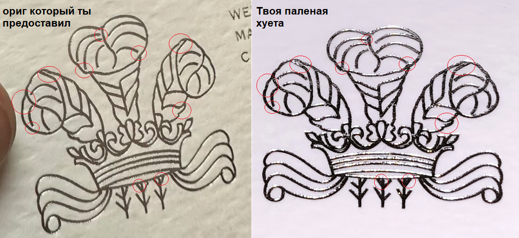 Бумага явно разная, на фото слева больше зернистость, и лого с лицевой стороны стороны проступает на сквозь, передавая рельеф. Но возможно это просто у тебя фото твоей паленки хуевое, тут особо не доебаться. Ну и бонусом обвел для тебя долбаеба самые очевидные места для ознакомления.