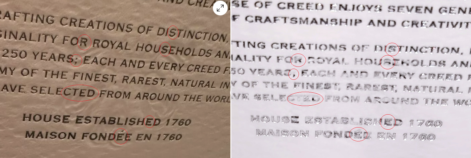 >>1903592 Так его, чтобы гарантированно оригинал, только за рубежом можно потестить. В рф кридов официально нет. Раньше стояли в молекуле. У барковских полноформатные криды оригинальные имеют оригинальную фурнитуру - специально для дотошных буквоедов-подозревак. Что до сэмплов, то у кридов их минимум джва вида: 1,7 мл и 2,5 мл, это к вопросу анона >>1903588. Откуда их берет мавлютов - знает только он, но что сэмплы подделывают - факт, при этом в отличие от гадания по флакону, где прошаренные тетки могут задетектить паль по мельчайшим поплывам шрифта, отличать паленые пробники от фирменных никому не сдалось.