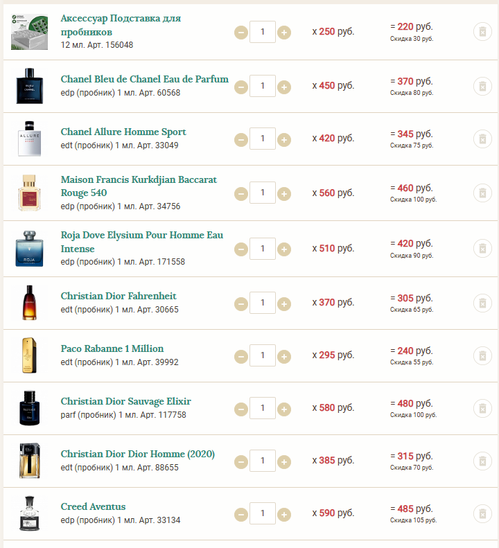 Анон, хочу заказать себе пробников самой попсовой попсы, вот первая десятка пробников, что скажешь? Конкретно хотелось бы уточнений по некоторым пунктам, ROJA, Bleu de Chanel, Dior'ы, там ниче сменить не стоит на более попсовые вариации типа с edp на edt и все в таком духе или я угадал всё правильно?