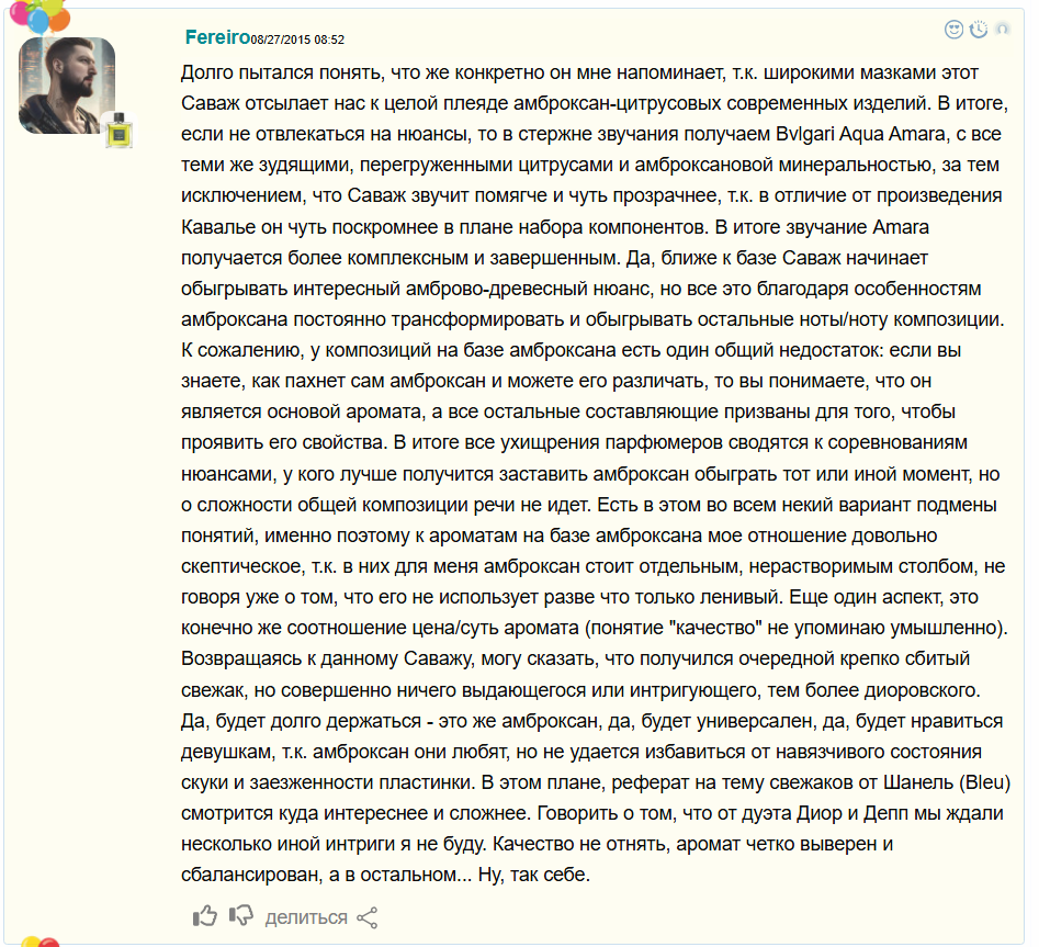 Касательно того, что ты просоленный моряк уже, то я тебе при всем желании не помогу. Т.к. 1) я знакомился с парфюмерией через интернет магазины не называю какой конкретно магазин, чтобы не получить статус менеджера аллюра в треде из-за чего я плохо знаю положняк по сетевым гигантам парфюмерии. да я их посещал но даже в условном каламбусе на м.Пражская я сейчас не вспомню в какой стороне зя а в какой ривгош. Я каждый раз тупа захожу и такой "о там парфюмерный гигант, пойду понюхаю". Короче говоря голову представленным ассортиментом не загружал, т.к. просто залпом их все проходил и все как в тумане... 2) Ну и я тупа такой уверенный мидл треда - уже не ньюфаг, но до эксперта еще расти и расти. 3) Я последние полгода-год вообще хуй клал на инфополе парфюмерии, обзоры не смотрел, закупался бегло и без задней мысли, тут не двачевал. Из контекста короче выпал. В данный момент наверное на новый виток парфманьячества захожу, но сказать пока нехуй