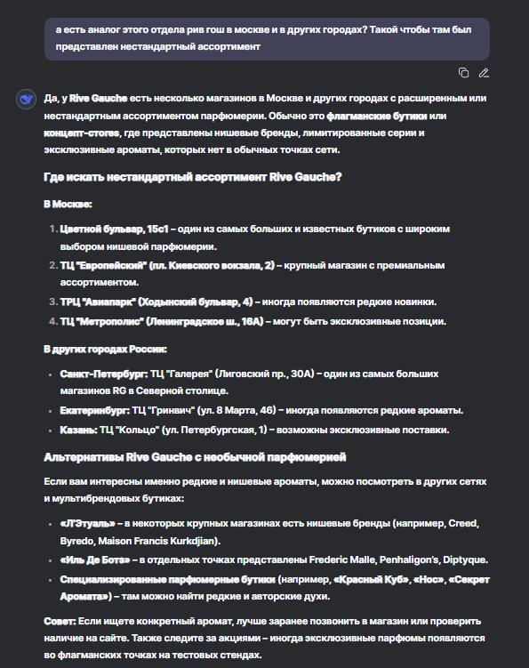 если вдруг ты в ДС1 едешь, то дичайше советую Рив гош на Цветном бульваре, 15с1 да и всем нуфагам с треда, кто туда еще не дошел. Ибо в этом здании какой-то нестандартный бохатый ТЦ наполненный санкционкой чуть более чем полностью. Ассортимент Ривгоша там просто мама не горюй. Ну условно, как будто, там 40+ ароматов елды, 20-30 бодичеи, весь вильгельм, весь маль и т.д.
