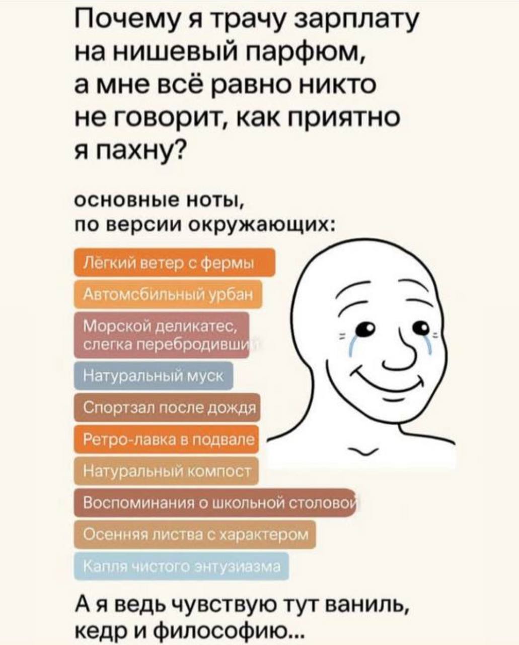 Отсюда делаем такой ултимативный опросник парфача 2025-2030: 1) лето день ("день" - офис, шарага) 2) лето вечер ("вечер" - блядки, встречи с кентами) 3) осень день 4) осень вечер 5) зима день 6) зима вечер 7) весна день 8) весна вечер 9) Бабоукладчик на вечер на все времена 10) Артхаус. Для хикки настроения, поймешь только ты, носишь для себя, в основном в одиночестве 11) Бурлеск. аромат чтобы все на корпорате или утреннике ахуели жестко в хорошем смысле, стать центром вечеринки через аромат. 12)Нормис. Самый универсалистый универсал для настроения "бля все заебало, надо че-то пшикнуть для галочки".