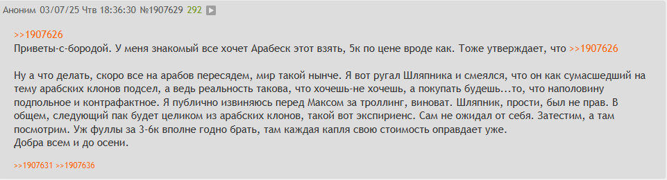 Приветы-с-бородой, ребят. Небольшое внеплановое включение. Что же, один месяц нелюбимого лета уже прошёл, а значит через два месяца уже наступит долгожданная осень. Подготовился я знатно, пак заказал очередной на 16 позиций аж (и ТФорды, и тёмная ниша, и винтаж, и летние бабоукладчики, все смешалось) - это рекорд пока что. Парфач удалять придётся, вероятно. Да он и так протух, мне смешно даже. Презентовал AllBlack Club, кстати, своим появлением на Алых парусах - на Мерсе s класса приехал в образе такого Неджати Арабачи, с-бородой только. Зумерье даже фотографировало. Жалко, что АФ и Бетмен прохладно отнеслись к созданию клуба черноебов. В общем, до осени.
