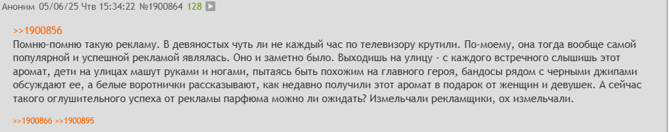 А фантазии Ивана связаны не с тем, что он молодой и не застал старые рекламы или ту же субкультуру готов (он их-то как раз застал), а с тем, что он компенсирует. Скорее всего, он родился в не совсем благополучной семье отсюда истории про отца, известного в СПб фотографа - демонстрация, что семья у него хорошая кое-как окончил юрфак отсюда постоянные неуместные вставки около-юридического сленга, откровенные фантазии по вопросам парфюмерии и не только - демонстрация, что он в теме, что он эксперт, сейчас работает в шаражкиной которе за мелкий прайс более-менее успешный юрист не может себе позволить чуть ли не целыми днями постить на дваче, а он же не только в парфаче постит, а во всем fa, и подозреваю, что в других разделах тоже