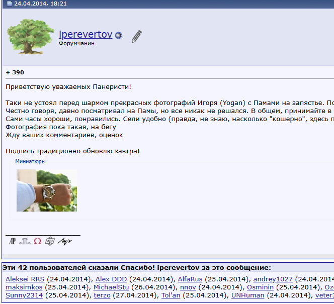 Таки не устоял перед шармом прекрасных фотографий с Памами на запястье. Подвернулась возможность заказать новые 390-е по очень приятной цене. Не устоял..) Честно говоря, давно посматривал на Памы, но все никак не решался. В общем, принимайте в ряды счастливых обладателей! Сами часы хороши, понравились. Сели удобно (правда, не знаю, насколько "кошерно", здесь просьба откомментировать). Больше всего нравится цвет циферблата - непередаваемо красивый, постараюсь поймать в кадр. Стрелки - тоже кайф, красиво отражают свет.