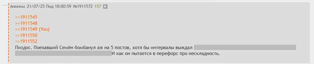 Не отвечайте, пожалуйста, на провокации >>1911173 И я не буду, все-таки модеров лучше не злить и не попадаться им на "карандаш", новые выборы в модеры же в сентябре, я должен с безупречной репутацией заявку подать. Такое утро хорошее, такой перекат и обсуждение фрагов.