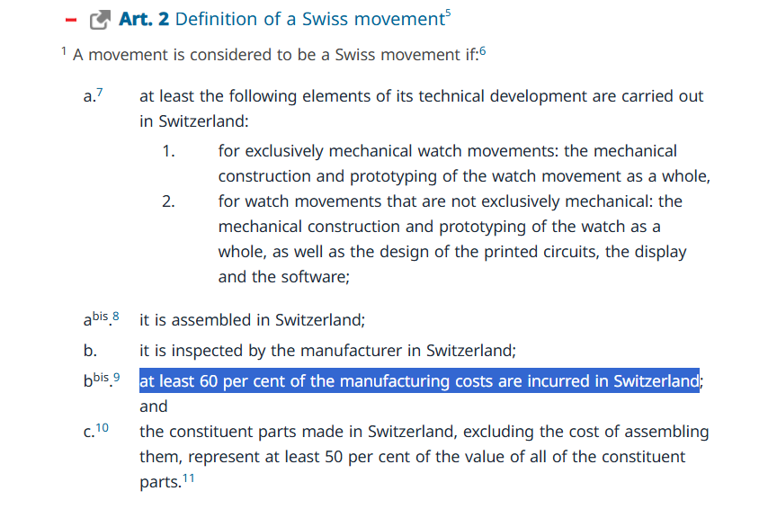 >>1913835 >У ролекс вообще не видел запчастей произведенных вне швейцарии Логично - деталь считается сделанной швейцарами, если в ней 60% затрат на себестоимости сделаны швейцарами. Можно сделать хоть в Бурунди и считать сделанным швейцарами, разница в стоимости труда позволяет. И это не я придумал такие условия, это сами швейцары придумали.
