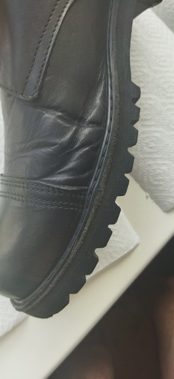 Дай думаю подберу стельки, зашнурую, попробую удобно ли сидят на ноге и только прошелся по комнате места заломов потрескались и стали в черной мелкой стружке, от блеска ни следа. Счистил щеткой эту черную пыль и теперь у меня полботинка блестят, полботинка заломлены, пиздос просто, а я над ними суммарно примерно часов 5 просидел