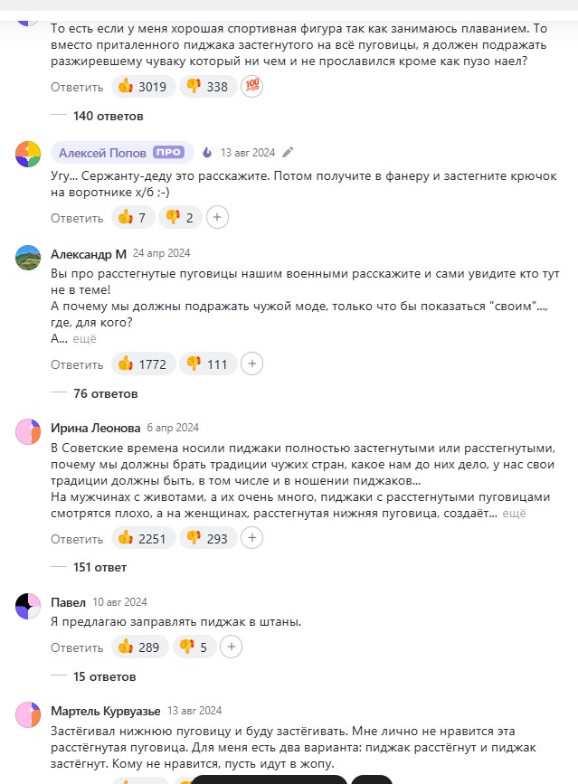 Я считаю, маркетплейсное быдло и какой-нибудь зашоренный хуй, который трясётся, когда лацкан на 2см толще, просто зассыт одеваться так. Да, кстати, пиджак надо брать с большими внутренними карманами, чтобы удобно было положить бутылку пива на вечерний променад и вообще карманы должны быть распороты, чтобы они выполняли свою функию - чтобы пачку сиг например носить. Вообше я не понимаю, нахуя делать карманы и зашивать их, а то ёпта нельзя в них ничего носить. Нахуй они тогда нужны?
