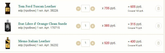 Пришли три парфюма во флакончиках по 30 мл. Плюс ещё два флакона из масс-маркета лежат в коробках. Ну и отливантов по 8 мл штук 30. Надо будет вам показать свою коллекцию.