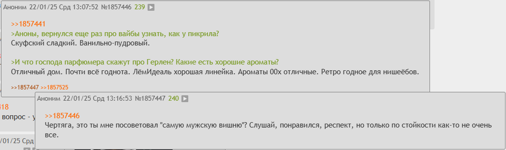 >>1923178 >Ну и где эталонная база знанийтм где есть инфа по всем ароматам типа ты пшикнул и сколько длиться должно и прочие проверки, че в шапке не висит. Не нужна. Твёрдо и чётко. Уже было, было юзлесс говно. >Вы вообще уверены что вы не паль купили? Да. >Мне кажется только в официальном магазине за рубежом можно быть уверенным. Если сильно трястись, можно вообще в это дело не лезть. >>1923184 >Данное мероприятие должно быть коллегиальным, а не основываться на мнении какого-то безносого анона. Наконец-то, моё любимое развлечение - смотреть как ньюфаги в очередной раз решают запилить гайд, и как они в очередной раз обосрутся с этим. Это дело не нужно делать, как минимум потому, что это будет необъективная и ангажированная хуета, не дающая никакого адекватного описания парфюмерии. Прошлый гайд был именно таким, плюс он ещё был куцым, ведь автор гайда предпочитал просто забрасывать определённые бренды говном. А если к этому делу подключится несколько анонов, то получится как в басне про лебедя, рака и щуку. Плюс не забывай - мы в 2025 живём, у нас даже сраную Шанель затестить без покупки проблематично. А кому интересно тратить огромные бабки на отливанты?