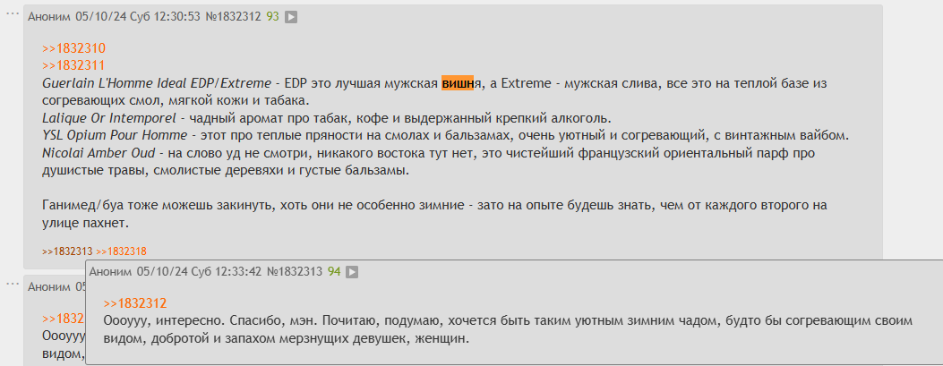 Сегодня +8 и впервые за год надел пикрел. Бля, какой-же он охуенный. Ещё и настоялся, резкость ушла просто пахент сладкой вишнёвой пудрой, такой сложной и приятной одновременно.