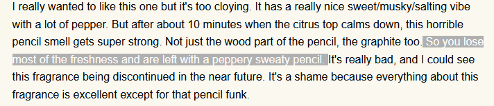 >>1928133 На старте действительно стартует свежо, именно элемы не слышно, дальше уходить больше в едва сладковатое дерево. Когда говорят что это свежий древесный парфюм это так и есть, отличная штука, относил с удовольствием уже полноразмерных 2 флакона.