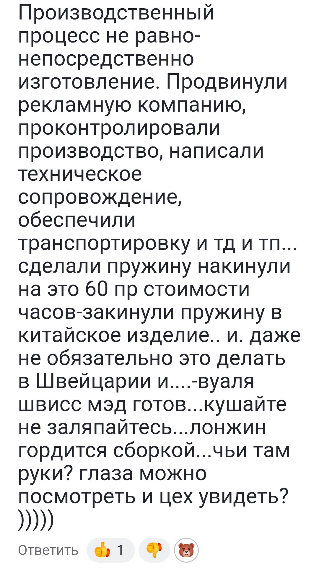 Но продолжим. Как солидные мартыханы представляют себе производство в стране с дешёвой рабочей силой, а контроль какчества в Швейцарии? Везти полусобранные ходики из Индии к швейцарам, у швейцаров утилизировать брак по швейцаровым расценкам и сборам на экологию, устранять мелкие неисправности за швейцаровы зарплаты? Или как это устроено в мохнатых головах?