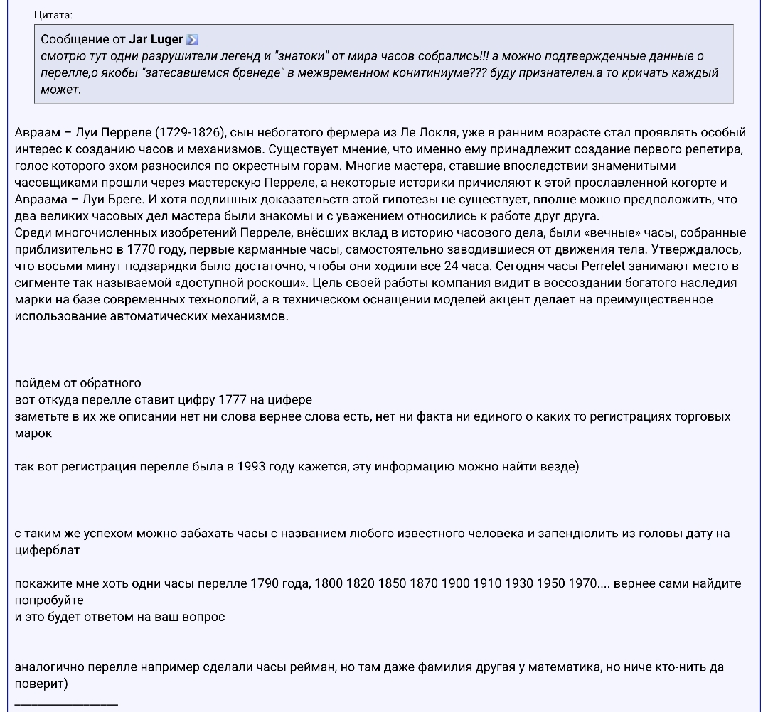 >>1929166 Вот тебе история про переле. Они буквально придумали себе историю, что к ним имеет какое-то отношение часовой барон переле из 18 века. Хотят писать на цифере 1777, хотя марке 40 лет.