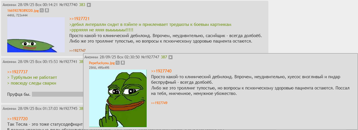 >>1929719 Ты ещё год тут усираться будешь со своим батхертным визгом? Как забавно, один раз повёлся на развод и обосрался, и сам себя годами накручиваешь. Тебе бы к хорошему психотерапевту, ты даже не представляешь, насколько твоя истерика ненормально выглядит со стороны. Лечись лучше, чем срать тут годами 24/7.