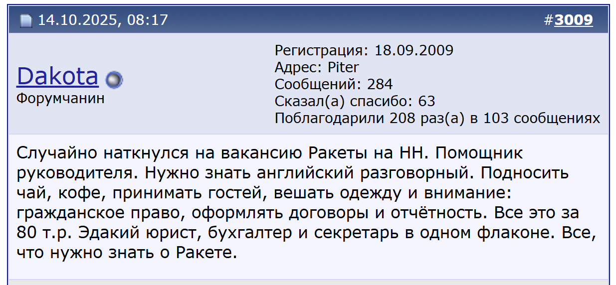 Свободный американский + пиэй 24/7 по нынешним расценкам 400-500 только за работу, без повышающих коэффициентов за длину ног. 80к было когда какетозник еще в подгузник тугосерил. Нагружать пиэй компетенциями департамента маркетинга, гражданским правом, бухучетом и "ведения финансово-хозяйственной деятельности" - колхозная дурка, без вариантов. Весь набитый дебсами, абсолютно весь, Какетозный госпиталь в этом мире есть Неудивительно что граф Полье побросал к хуям какеты и сбежал, прихватив иконы и бабки. Последний вменяемый покинул юдоль халтуры.