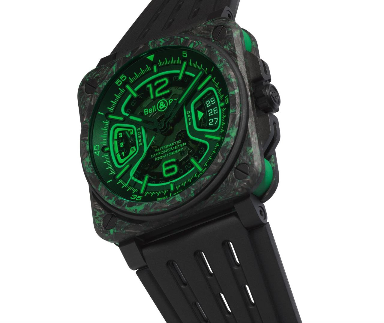 Кому осенью перестало хватать света - лимитка Bell & Ross BR-03 Night Vision. 250 экземпляров, продолжающие эсперименты марки со светом. Особенность тут - корпус из LUM-CAMO, композита, сочетающего углеродное волокно с люминесцентной смолой. Переднюю и заднюю пластины соединяют винты в защитных цилиндрах из фотолюминесцентного зеленого каучука. Посередине - титановая часть с черным DLC-покрытием. Размер корпуса - 41 x 13,3 мм, водонепроницаемость 100 м.
