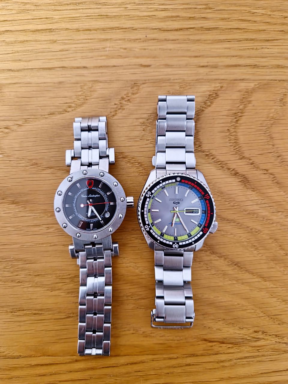 Сейко для сравнения размеров. Хоть и ламборгини меньше и ремешок более узкий, но весят на 5 гр больше. У ламбы хоть и безель меньше как и по диаметру, так и по глубине, но очень тяжелый
