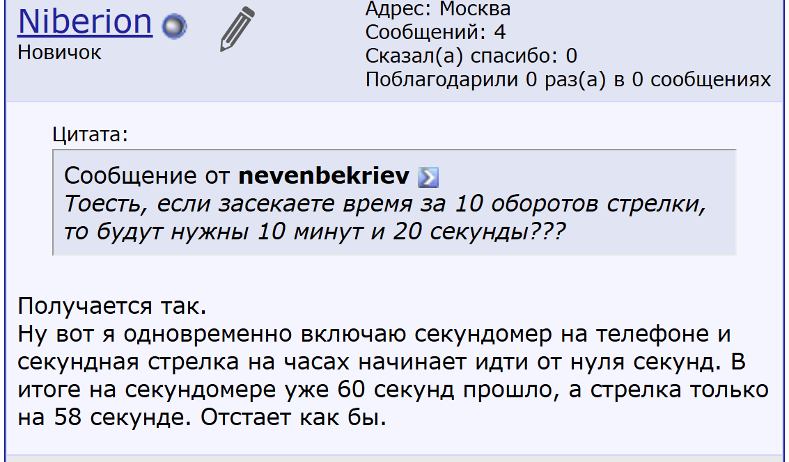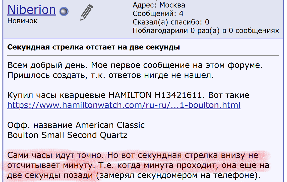 Понятно что проебались с передаточными числами в ангренаже - от двигателя к секундному колесу на !/30 больше нужного, от секундного н минутному на 1/30 меньше. Так получится конструкция когда минутная и часовая стрелки двигаются правильно. а секундная за минуту отстаёт на два деления. Вопрос: как такое стало возможным? Производственный брак? Невозможно, получился бы просто нерабочий кварцевый модуль. Конструктивный дефект? Тоже невозможно - новый модуль для массовой и дешевой swiss made хуиты делать не будут, берут готовые и проверенные. Конкретно у потерпевшего это 980.163, древнее и миллионы раз проверенное говно. Потерпевший всё выдумал? Тоже маловероятно, слишком инновационно и бессмысленно. Незачем выдумывать плохое про гомильтон, он и так кривая дешёвая параша.
