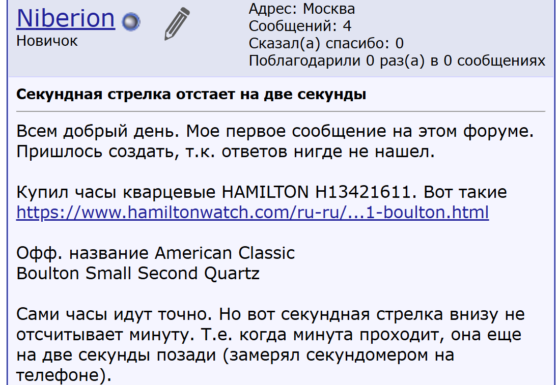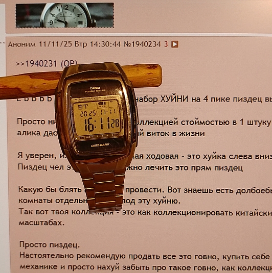 Хотите рофл? Всё-равно расскажу. Есть пикрил на востоковском 2403, думал... не знаю о чём думал когда их брал задолго до форса генеральских котлов, у не было тогда никакой механики и чего-то тоненького, костюмного. При получении бежали ровно на минуту вперёд, при чём тупо заводил и оставлял лежать сутки, один день активно носил, один хрен. Потом выставил по мобильной проге, лежали пару дней, шли +10, недавно ещё чуть корректировал во время носки по-наитию, они пятый день идут 0! При чём в выходные просто лежали, и подзаводил их чтобы не забыть в разное время. Я вообще удивлён что подобный мех способен такое выдавать, у меня до этого Сейки-5 вроде шли +10 с новья, а за 10 лвл эксплуатации набрали +35, которые никак нельзя было отрегулировать даже часовщику после репассажа. Или это просто потому-что новьё с околонулевым износом? Мне прям опять механику поприличнее охота купить. И кстати, каково мнение местной публики по репассажу, и кварца в том числе? Если брать относительно кондовые механизмы вроде упомянутых, с отсутствием сертифицированных сервисов, но наличием по рекомендациям хорошего спеца.
