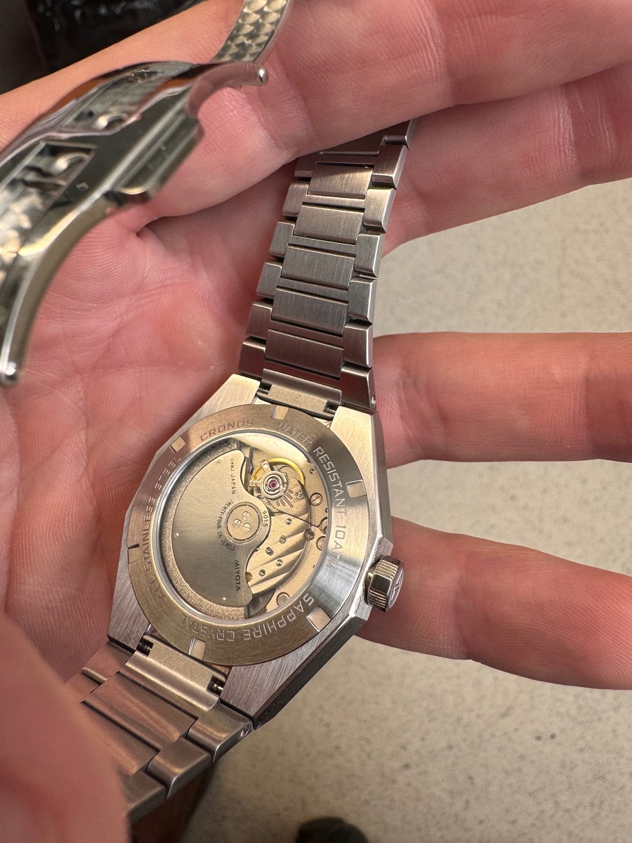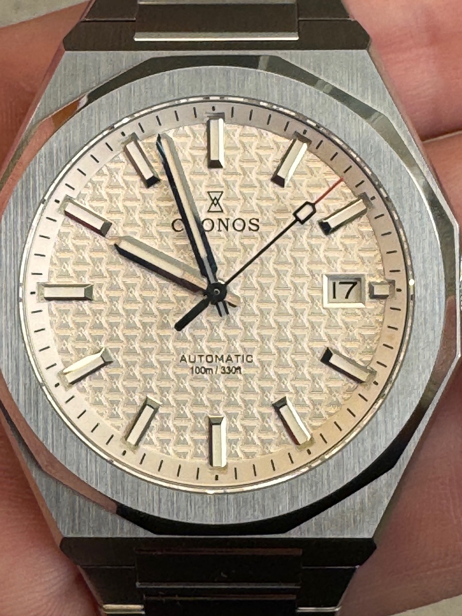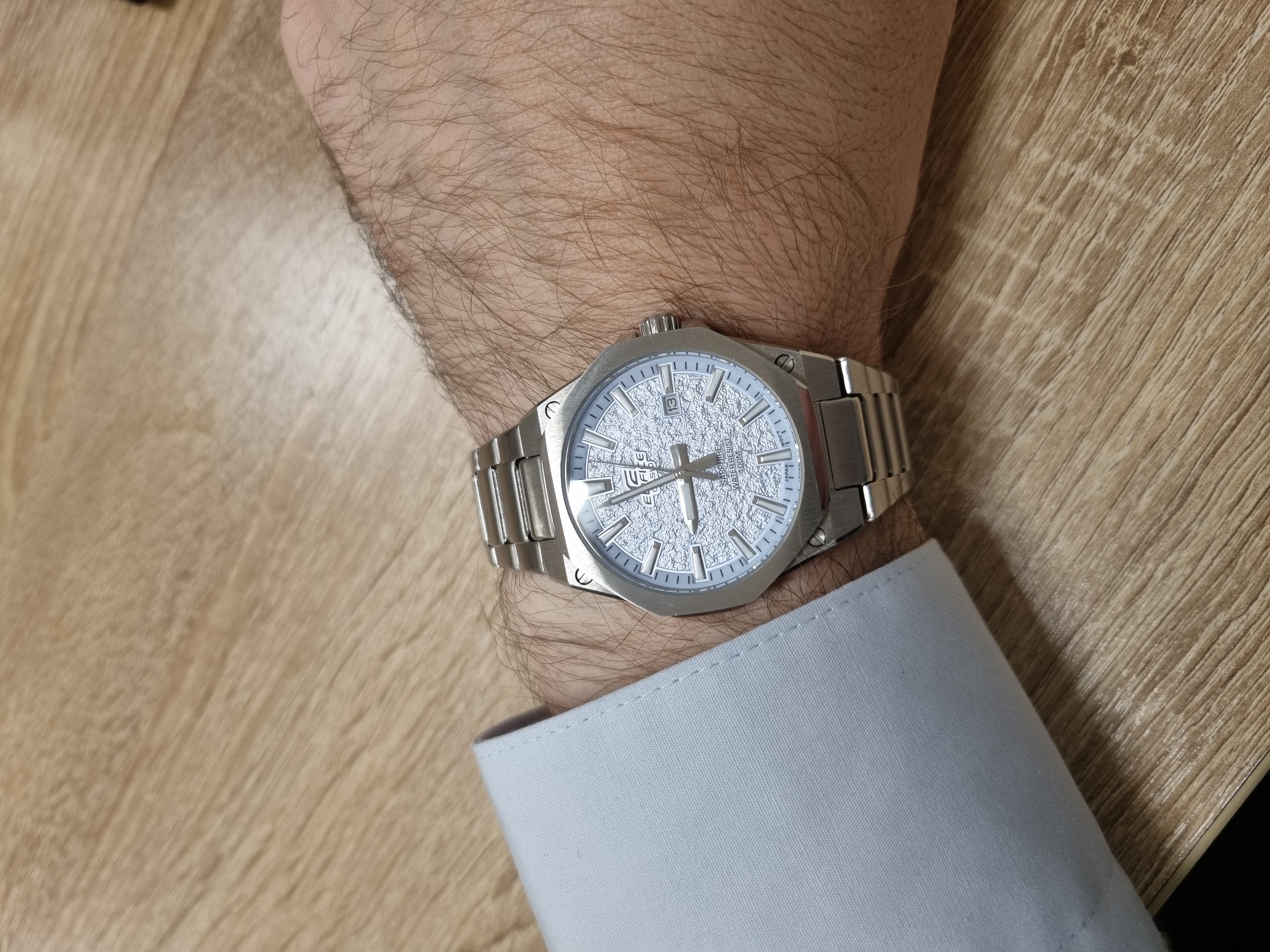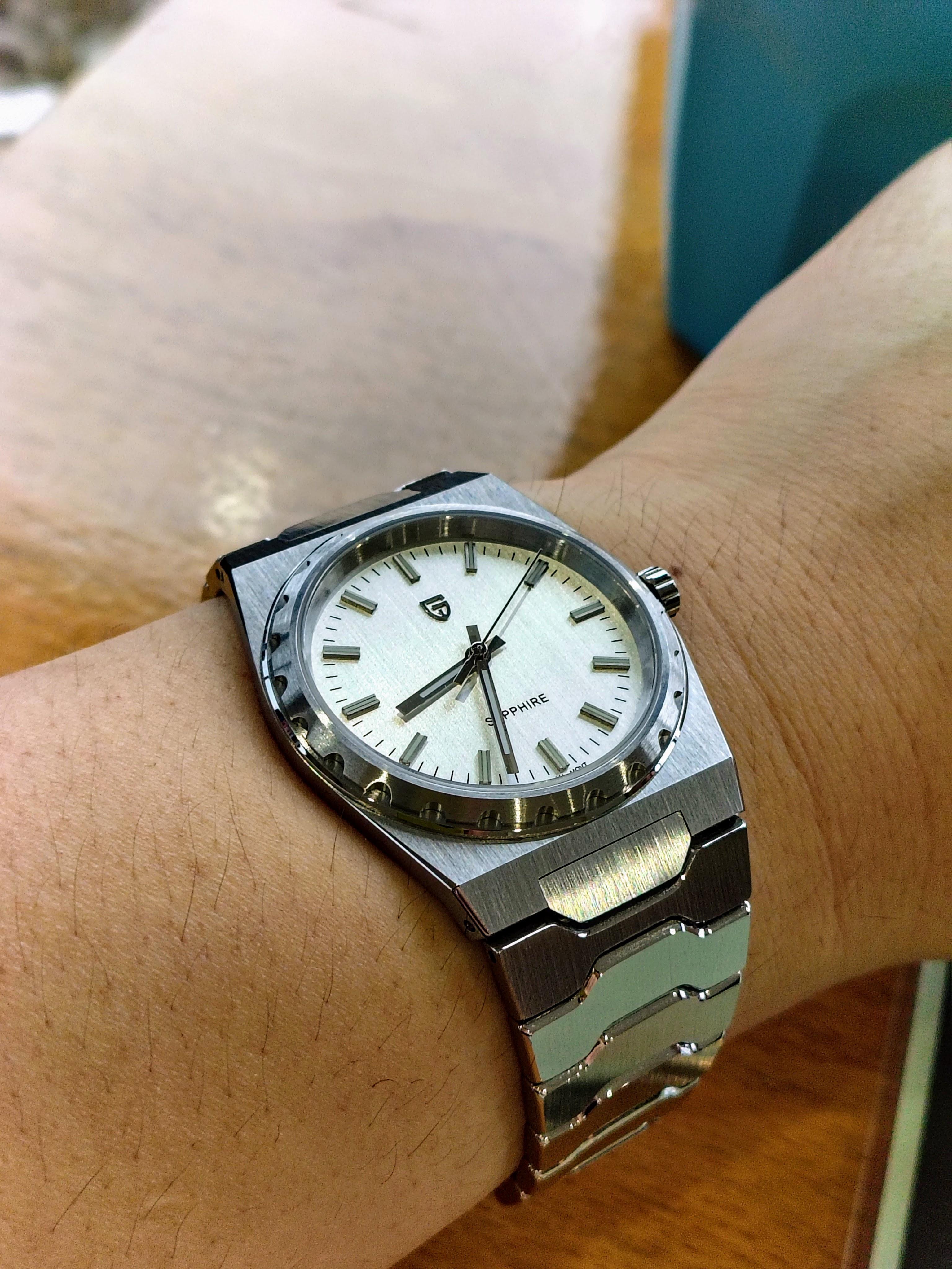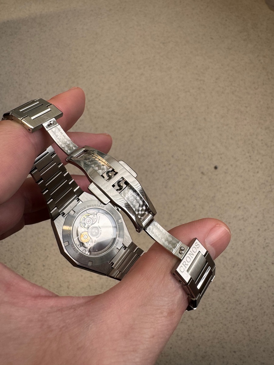 Пришел белый Cronos Skyline. Часы производят впечатление законченного продукта. Задняя крышка даже с ТТХ, в отзывах видел и стерильную и с надписями, задал вопрос продавцу, он ответил, что только у PT5000 крышка с ТТХ, но мои на 9015 пришли с такой же. Браслет волосы не щипает, даже снял два звена, первый раз такое с кроносом, обычно в притык. Немного смущает сатирование верхней части часов. В момент распаковки на руке были Borealis Olisipo и на их фоне Cronos конечно проигрывает, но в общем часы очень приятные и однозначно рекомендуются к покупке если хочется подобный форм фактор.